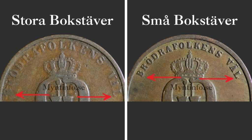 Den första varianten kallas för Stora Bokstäver. Den kännetecknas av att texten och valspråket på åtsidan är präglade med stora bokstavspunsar som breder ut sig längs kanten. Ett enkelt sätt att identifiera denna är att valspråket upptar nästan halva myntets omkrets.
