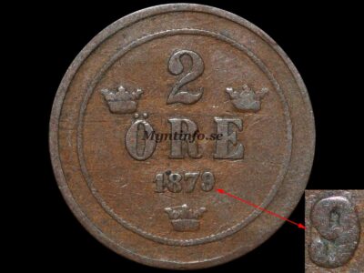 2-Öre 1879 (Rätvinkligt Kors & 9 På Upp Och Ner Vänd 9)