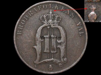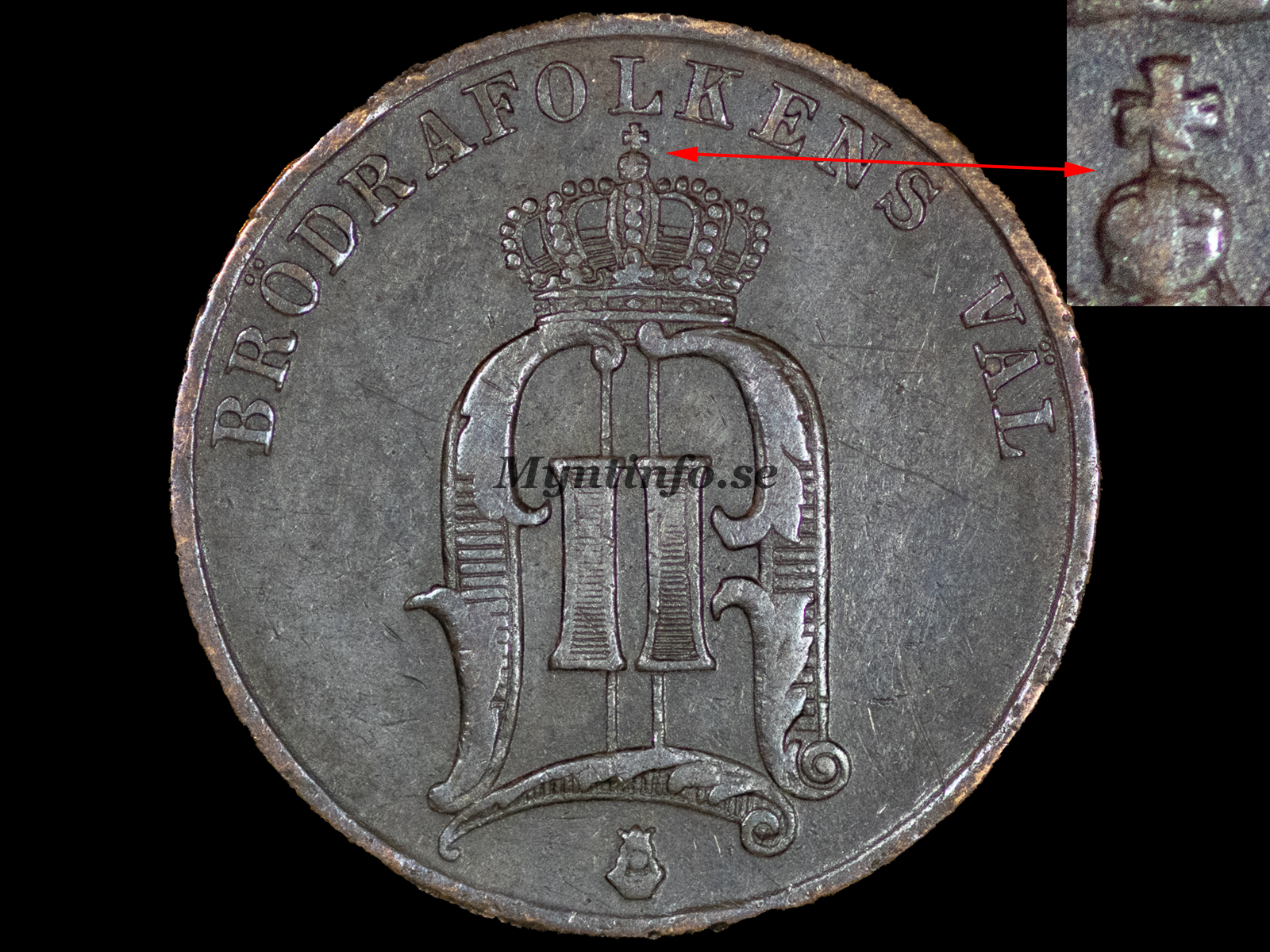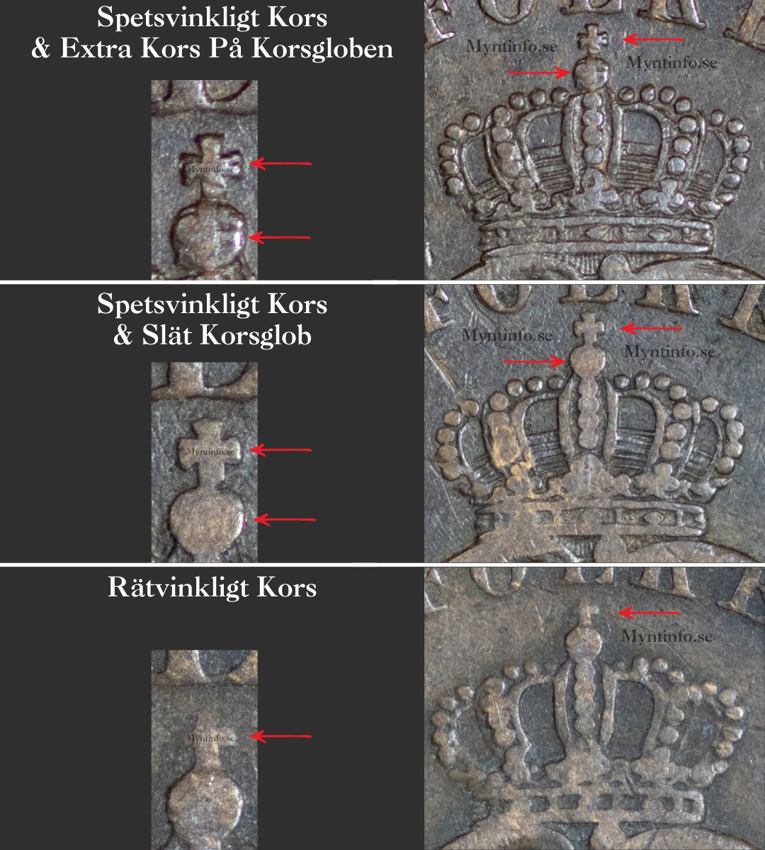 Förekomsten av ett extra kors på korsgloben (Variant 1) är mycket ovanlig. Vår teori på Myntinfo är att detta kan ha uppstått genom en så kallad dubbelpunsning eller en oavsiktlig skada på moderspatrisen som skapat ett mönster som liknar ett kors.
