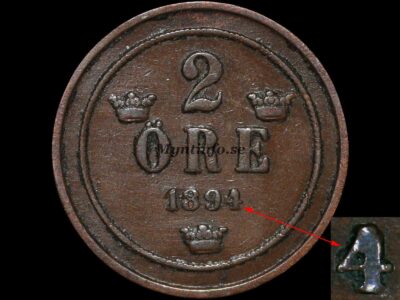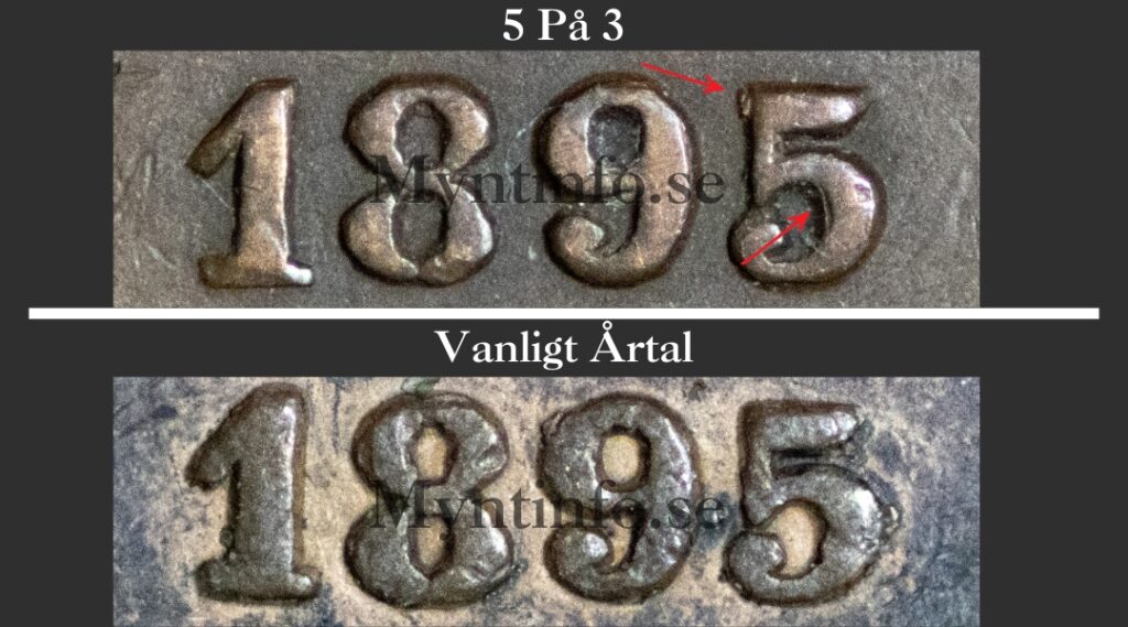 Att man har valt att punsa en femma över en trea (från 1893) snarare än över den mer närliggande fyran är en mycket intressant observation. Vi på Myntinfo har en teori om att detta beror på en specifik stampbrist vid Myntverket under början av 1895.