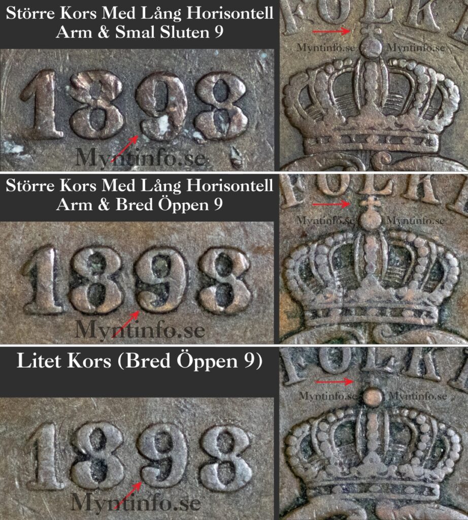 Det faktum att vi ser två olika nior kombineras med samma stora kors, för att sedan se den vanliga nian kombineras med ett helt nytt litet kors, leder oss till en intressant teori. Vi på Myntinfo misstänker att man under 1898 arbetade med flera olika uppsättningar av både sifferpuntsar och kronsymboler samtidigt.