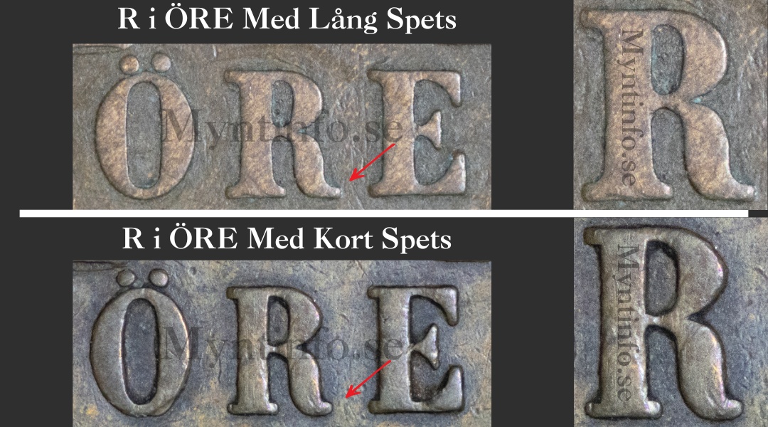 Den andra varianten är något vanligare och vi benämner den som R i ÖRE Med Kort Spets. Här är spetsen i slutet av R:et (längst ner till höger) något kortare, och likaså är spetsarna på bokstavens rygg mindre framträdande. Något som ibland nämns specifikt kring denna variant är att den sista nian kan visa spår av ompunsning. Det är inget vi på Myntinfo själva har sett ännu, men vi kommer att hålla ett extra öga på detta framöver.