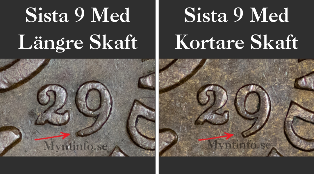 Den första varianten vi ska gå igenom är den betydligt mer sällsynta varianten av de två. Denna variant kan ibland på marknaden kallas för ”29 med längre skaft” eller ”9 med längre skaft”, och även om båda dessa namn är OK, bör man kalla den för Sista 9 Med Längre Skaft. Det beror på att det specifikt handlar om enbart den sista nian och inte har något med siffran 2 att göra. Denna variant är rätt lätt att känna igen då skaftet på den sista nians nedre del är något längre; det går faktiskt så pass långt åt vänster att det nästan går över nians övre ögla.