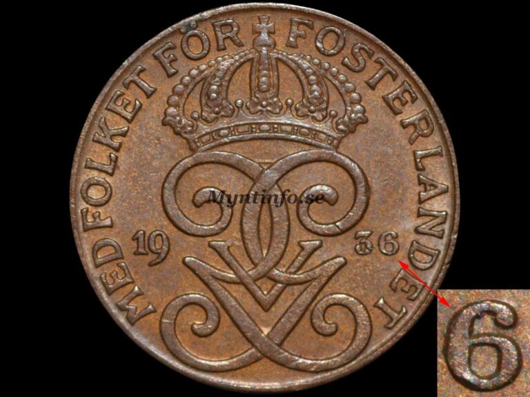 För år 1936 hittar vi två välkända och väldokumenterade varianter i 2-öresserien. Det här är ett mönster som återkommer på flera svenska valörer från samma tidsperiod och handlar om designen och storleken på siffran 6.