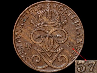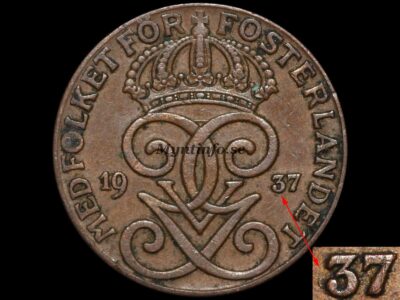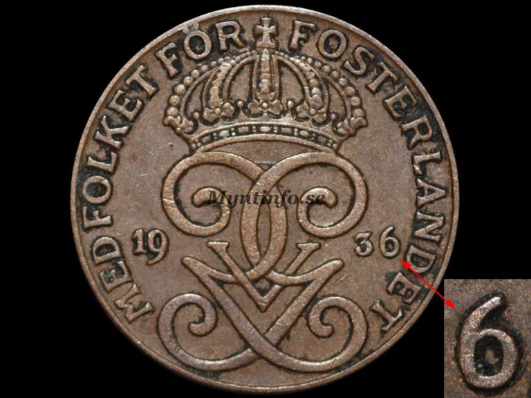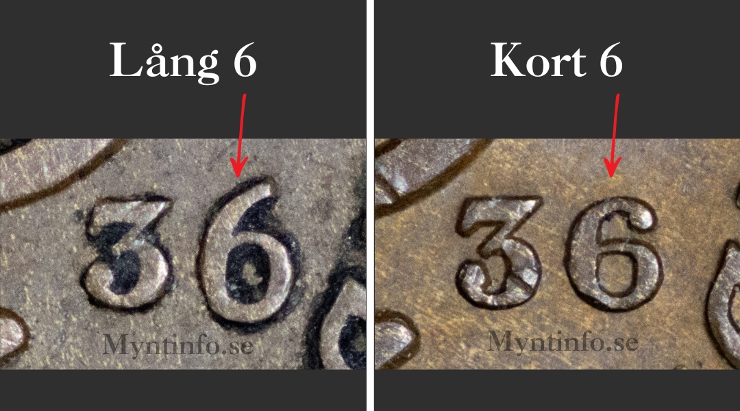 För år 1936 hittar vi två välkända och väldokumenterade varianter i 2-öresserien. Det här är ett mönster som återkommer på flera svenska valörer från samma tidsperiod och handlar om designen och storleken på siffran 6.