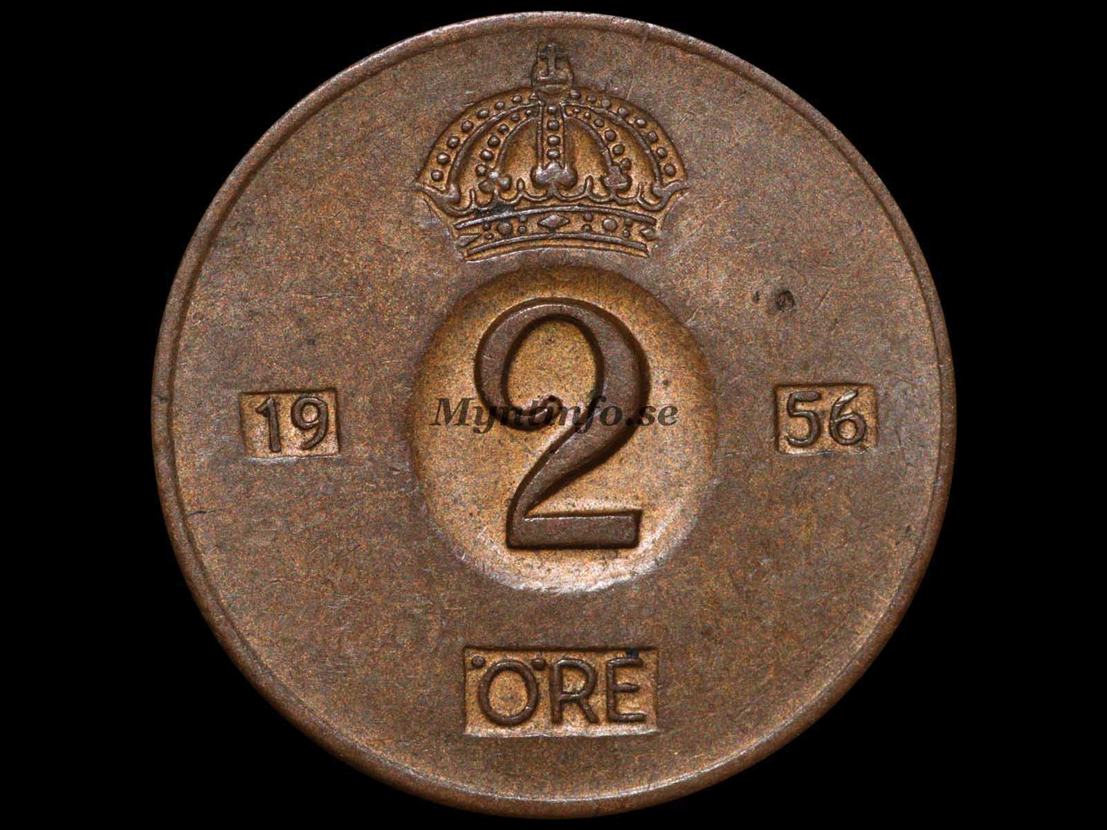 För år 1956 finns det två kända varianter i 2-öresserien. Den ena är betydligt sällsyntare än den andra och är ett välkänt samlarobjekt i den numismatiska litteraturen.