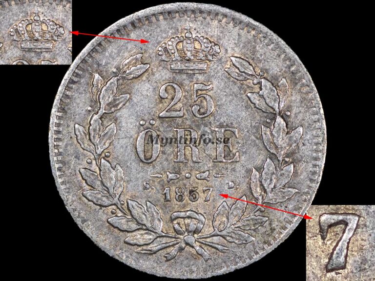 År 1857 är ett riktigt spännande år inom 25-öreserien, då det finns totalt fyra dokumenterade varianter. Här nedan går vi igenom samtliga med tydliga beskrivningar och bildmaterial.
